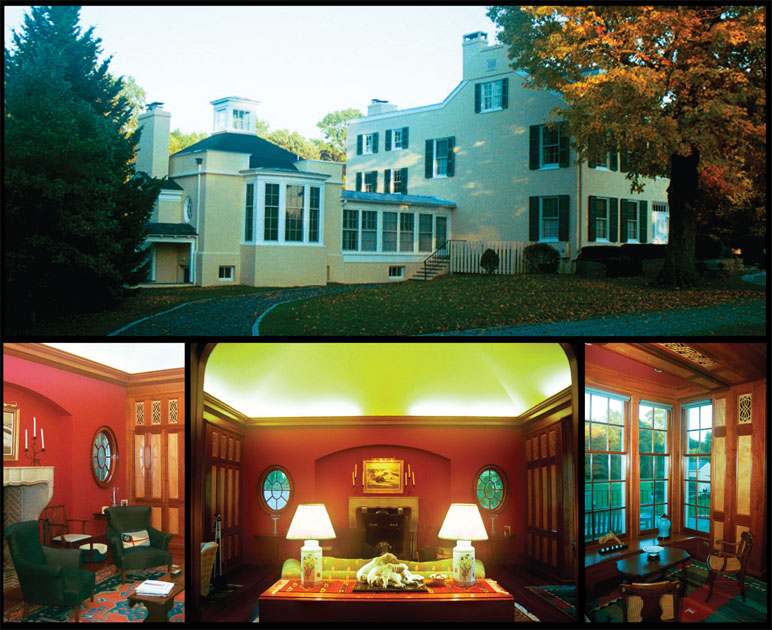 Addition to a c. 1830 house near New London with large bay windows and exquisite woodwork concealing wet bar, media equipment, and bookcases.